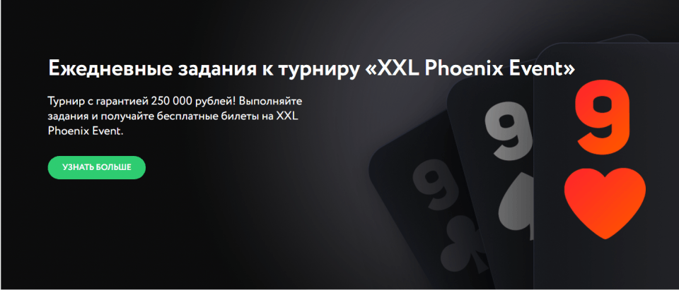 На момент написания статьи в ПокерДом проходит акция, связанная с новым турниром «XXL Phoenix Event». Попасть в него можно заплатив бай-ин 9 999 рублей, но понятно, что не все желающие могут осилить такую сумму. Специально для них рум запустил акцию, смысл в том, что необходимо выполнять ежедневные задания за рублевыми кэш-столами с Омахой и Техасским Холдемом. Миссия простая: собрать Каре или Фулл Хаус с 9, причем две карты обязательно должны быть карманными, доходить до вскрытия необязательно. За выполнение задачи игрок получает билеты на «XXL Phoenix Event», различного уровня.