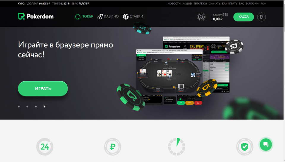 Остановимся на том, какой вид имеет полная версия сайта ПокерДом. В самом начале пользователя встречает рекламный слайдер с актуальными акциями и действующими бонусами, это поможет не упустить выгодное предложение и воспользоваться им. Сверху слева представлены курсы валют по отношению к рублю: доллары, евро и тенге. Справа находится основное меню, имеющее главные вкладки: