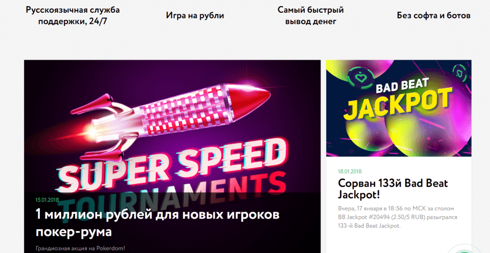 Покер-рум ПокерДом – одна из крупнейших площадок на территории России и СНГ. Здесь поддерживается игра на рубли, имеются множество покерных дисциплин, выгодные бонусы и акции, слабое поле игроков и масса других плюсов. Недаром рум на сегодняшний день имеет аудиторию более 1 000 000 уникальных пользователей.
