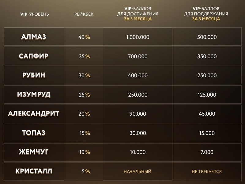 Конкретный пример. Клиент достиг ступени изумруд, чтобы ее сохранить, требуется наиграть не менее 125 000 поинтов в течение трех месяцев. В противном случае он окажется на уровне Александрит.