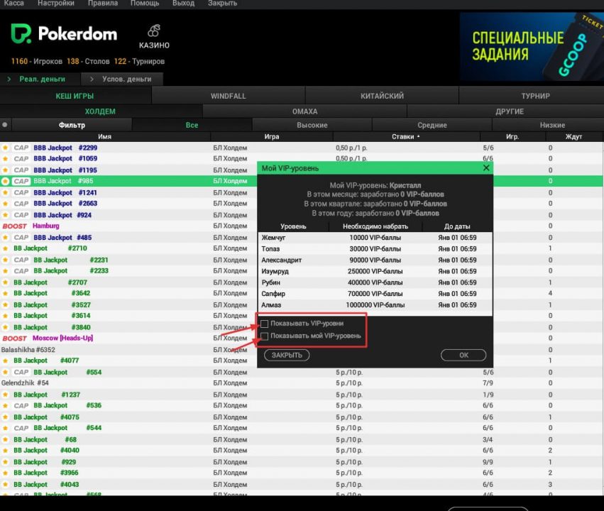 Многие игроков интересуется, как отключить VIP-уровень в ПокерДом в клиентской версии. Сделать это очень просто: нужно кликнуть по иконке статуса и во всплывшем окне убрать галочки с пунктов «Показывать VIP-уровни» и «Показывать мой VIP-уровень». Затем нажать по кнопке «Ок». После этого мешающий показатель не будет отображаться. Как видно, все довольно просто и отнимает всего несколько секунд.